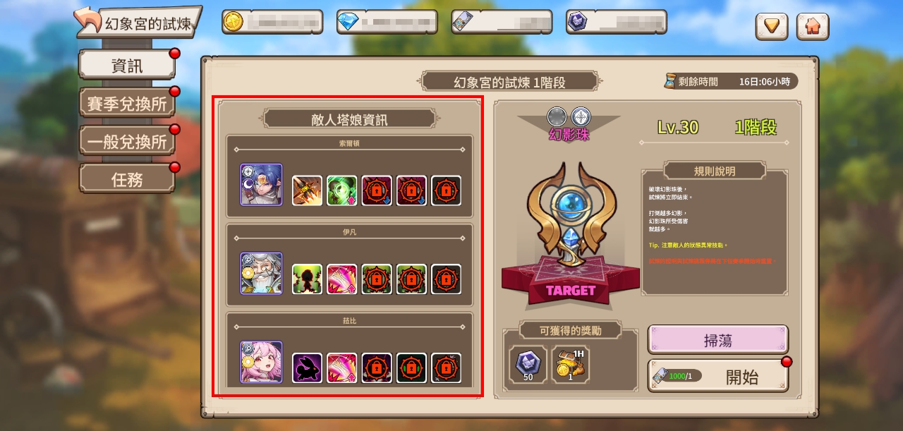 透左側的資訊欄位,可以得知本賽季幻象宮中敵人塔娘資訊